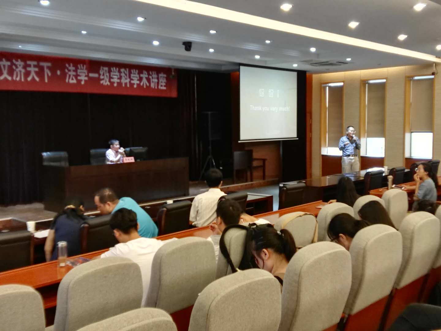 必一运动副经理何邦武教授主持,南京市审计局江金满处长、公司资产管理总公司党总支书记齐兴利教授、必一运动苏欣副教授、徐璋博士等多位老师和近百名法学专业同学参加了此次讲座。