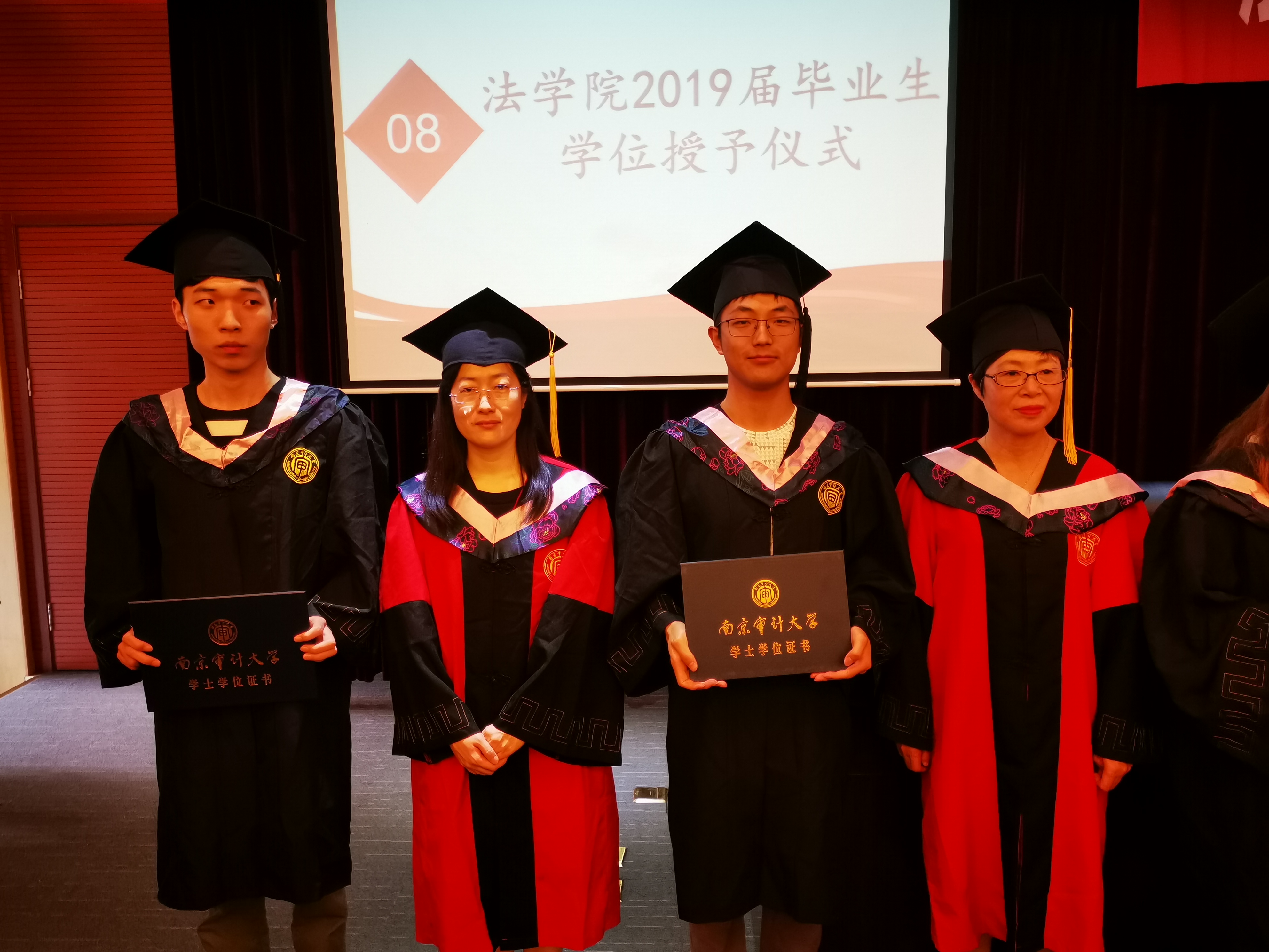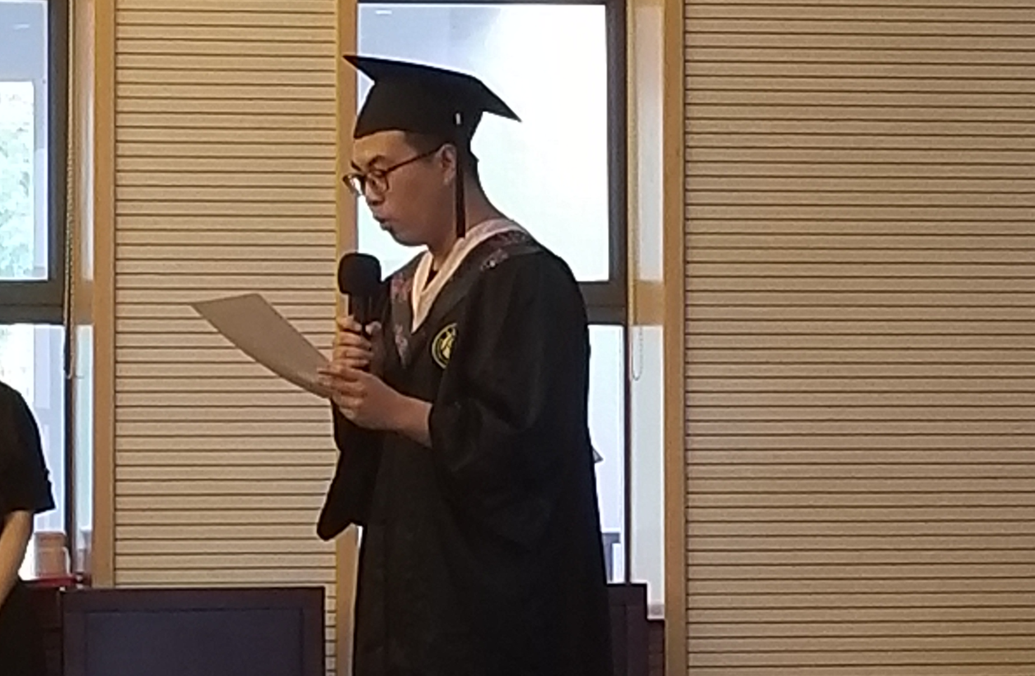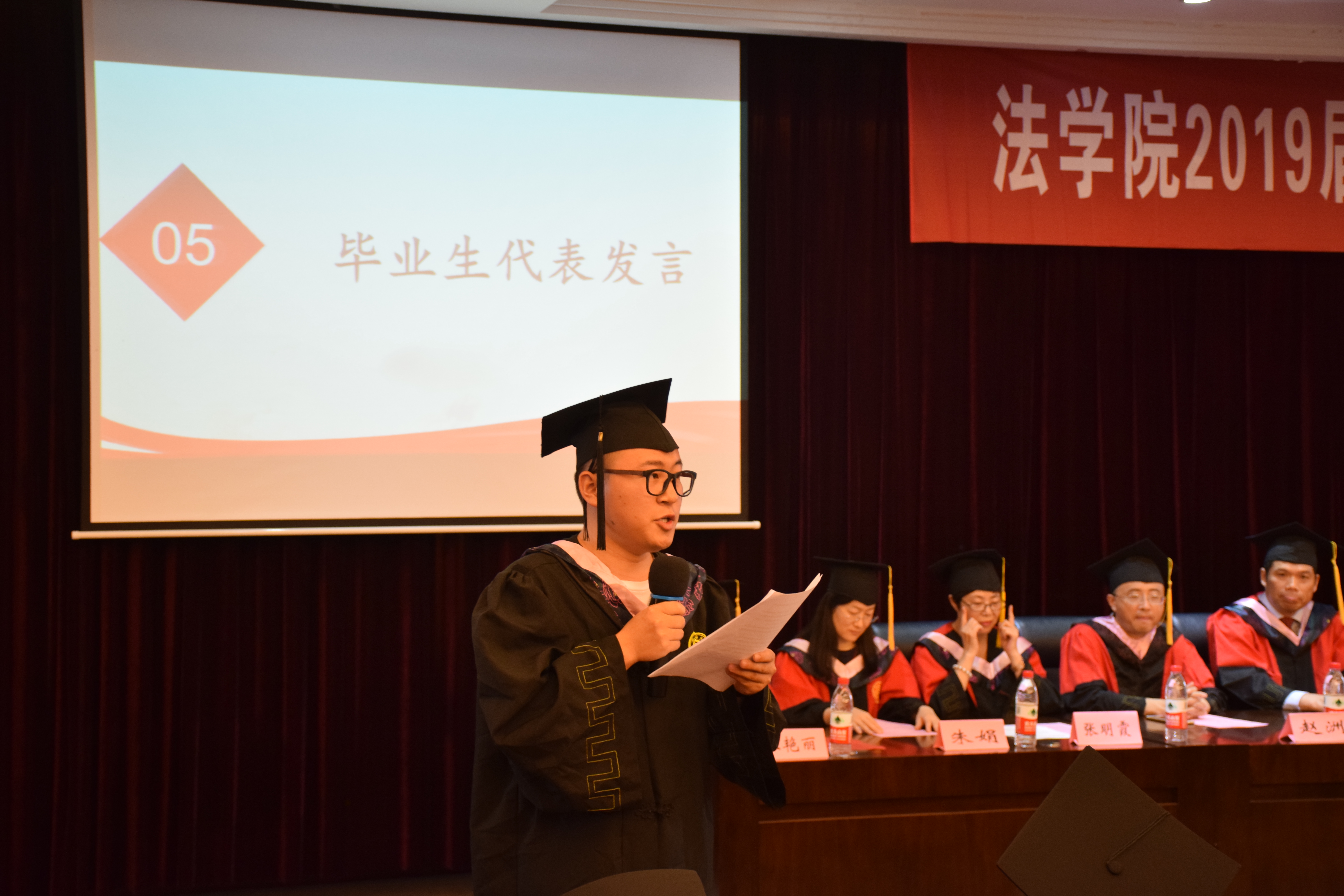 毕业生代表庄严和张一弛同学分别发言,他们表达了对母校栽培和老师谆谆教导的感谢,回忆了在南审成长的点点滴滴,以及对四年大学时光的不舍和对未来美好的期待和憧憬,并表示他们必将牢牢记住母校的培养和老师们的深情嘱托,勇敢前行,以“诚信求是笃学致公”的校训为动力,脚踏实地朝着美好未来努力前进,争取在今后的学习和工作中展现南审法律人的风范,坚守南审法律人独有的精神,争取有朝一日回报母校。