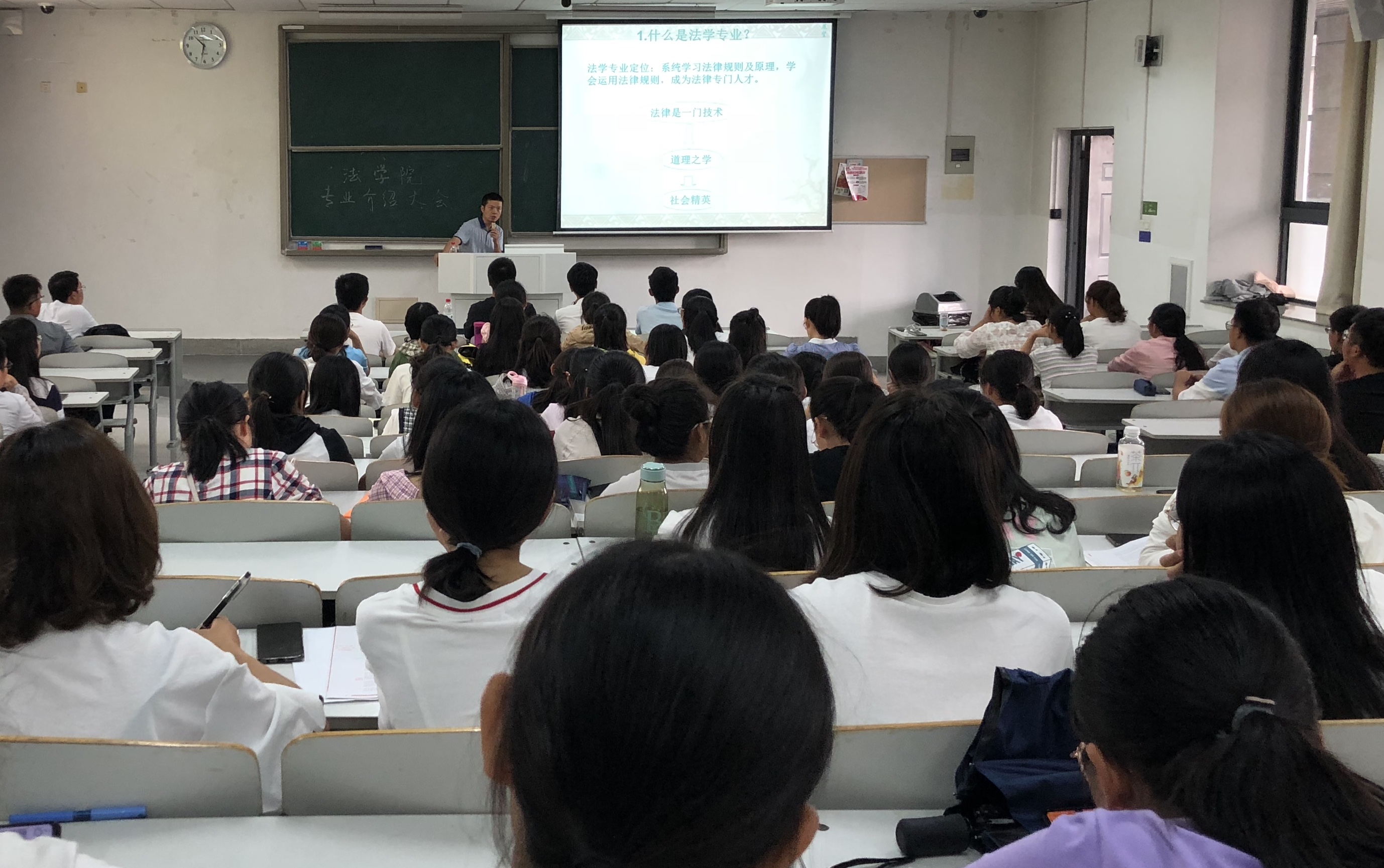 9月20日上午,法学专业教育大会由孙展望主任主讲,他从“什么是法学专业”、“法学专业就业特点及前景”、“南审法学专业模式”、“优秀法科生的标准”四个视角,为19级法学专业的新生们上了一场生动的专业教育课。首先,孙展望老师指出,法学专业的定位是系统学习法律规则及原理,学会运用法律规则解决问题。接着,他指出当前法学专业的就业挑战和机遇并存,法学专业的就业门槛较高,而高级法律人才的仍然匮乏,希望同学们努力提高专业技能和综合素养,从容应对挑战,抓住机遇。他还对南审法学专业人才培养方案做了详细介绍,他指出法学专业学习要兼顾通识课程、法学专业课程和法律实践的学习,使同学们对专业有了更为清晰的目标和努力方向。最后,孙展望老师强调了一名优秀法科生应当具备扎实的基本专业素养,应该有对国家法治建贡献力量的雄心壮志。孙老师语重心长地表达了对同学们殷切的希望,期待同学们成为社会的精英,国家未来法治建设的中流砥柱!