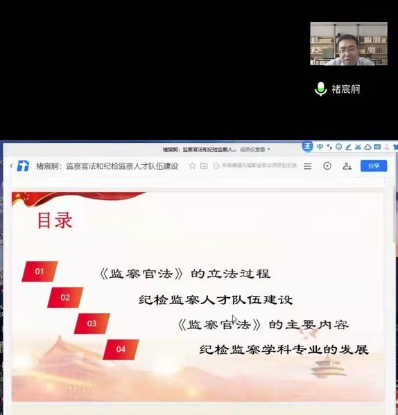 会议开始,王艳丽经理向参与此次会议的师生介绍了褚宸舸教授的学术成果并对褚教授的到来表示热烈欢迎。继而,讲座正式进入正题。褚教授从“纪检监察人才队伍建设”“监察官法”和“纪检监察学科专业的发展”这三个概念关系出发,向同学们讲述《监察官法》的立法目的和意义,接下来围绕《监察官法》立法过程、主要内容、纪检监察队伍人才队伍建设和学科发展这四个问题详细展开。自2019年12月中纪委正式提出草案以来,《监察官法》经历了全国人大的调研、一审、二审,最终在上个月20号通过。在《监察官法》的内容部分,褚教授将《监察官法》定位为责任法、监督法和保障法。与其他法律职业伦理相比,监察官职业伦理更加强调政治性、坚定性、责任感、严格性和模范性。在纪检监察人才队伍建设的问题中,褚教授以陕西为例将纪检监察队伍现状和特点娓娓道来,指出了基层纪检监察队伍的问题并强调要建立高素质、专业化的纪检监察干部队伍,要培养政治素质、职业伦理和专业技能全面发展的纪检监察人才。此外,褚教授还对新入学的研究生的未来学习和研究做了入学指导,纪检监察学科是十分有前景的,欢迎各位同学从事监察法的相关研究,进入到纪检监察的工作队伍中去。
