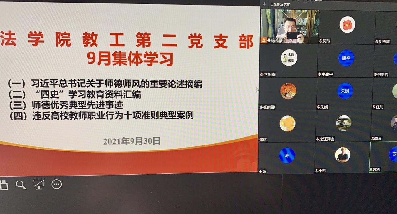 9月30日上午,教工第二党支部围绕师德专题学习教育要求开展集体学习,就习近平总书记关于师德师风的重要论述摘编等内容交流了心得、体会。支委会首先对支部开展师德专题教育的工作情况做了初步总结,并对下一步的工作安排做了介绍。结合学习心得与教学科研工作体会,支部书记陈苏豪同志提出了“新时代教师是应该坚持积极师德观,还是消极师德观?”这一话题,引发了全体参会教师党员热烈讨论。