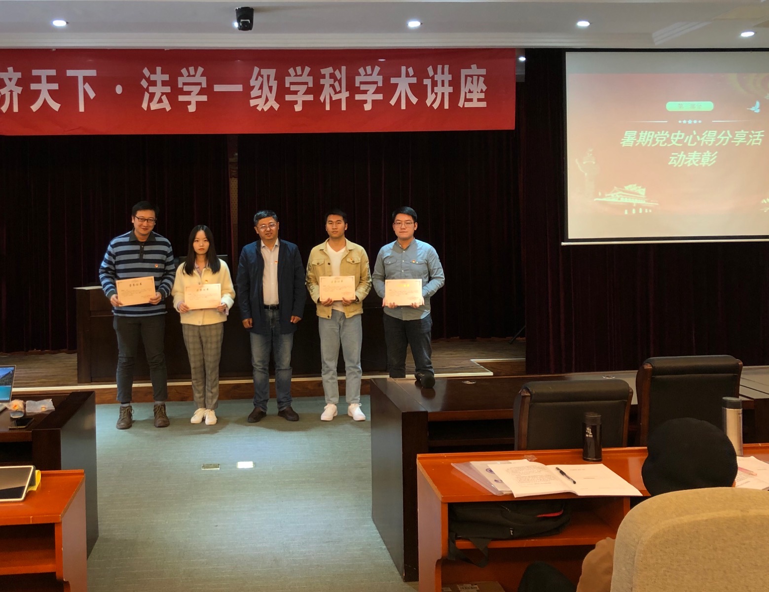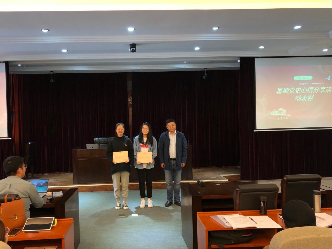 随后,会上就暑期“坚守理想,践行初心——学习贯彻‘习近平总书记在庆祝中国共产党成立100周年大会上的重要讲话精神’”线上学习分享活动进行了表彰,并由刘宏宇书记向获奖党员颁发奖状,其中一等奖获得者为王志清、王昌鸿,二等奖获得者分别为俞陶涛、胡蝶、冀硕、胡凌宇,三等奖获得者分别为袁俊杰、温家珠、朱红、吴轩孜、俞晓婷。