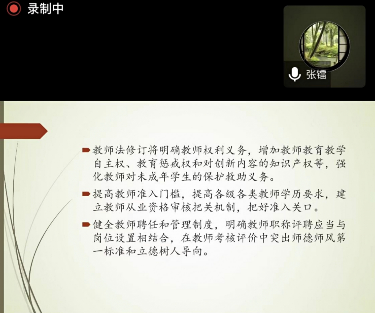 最后,张镭教授阐释了本次《教育法》修订的主要内容,其中修订最大的是第七十七条,该条文吸收了《刑法修正案(十一)》的相关规定,同时又充分地回应了社会关切,将习近平法治思想的“十一个坚持”落实到法治实践中去。张镭教授呼吁各位教师积极为《教师法》的修改建言献策,提供智力支持,进一步完善和发展教育法治体系,为中国教育法治的发展努力作出应尽的贡献。
