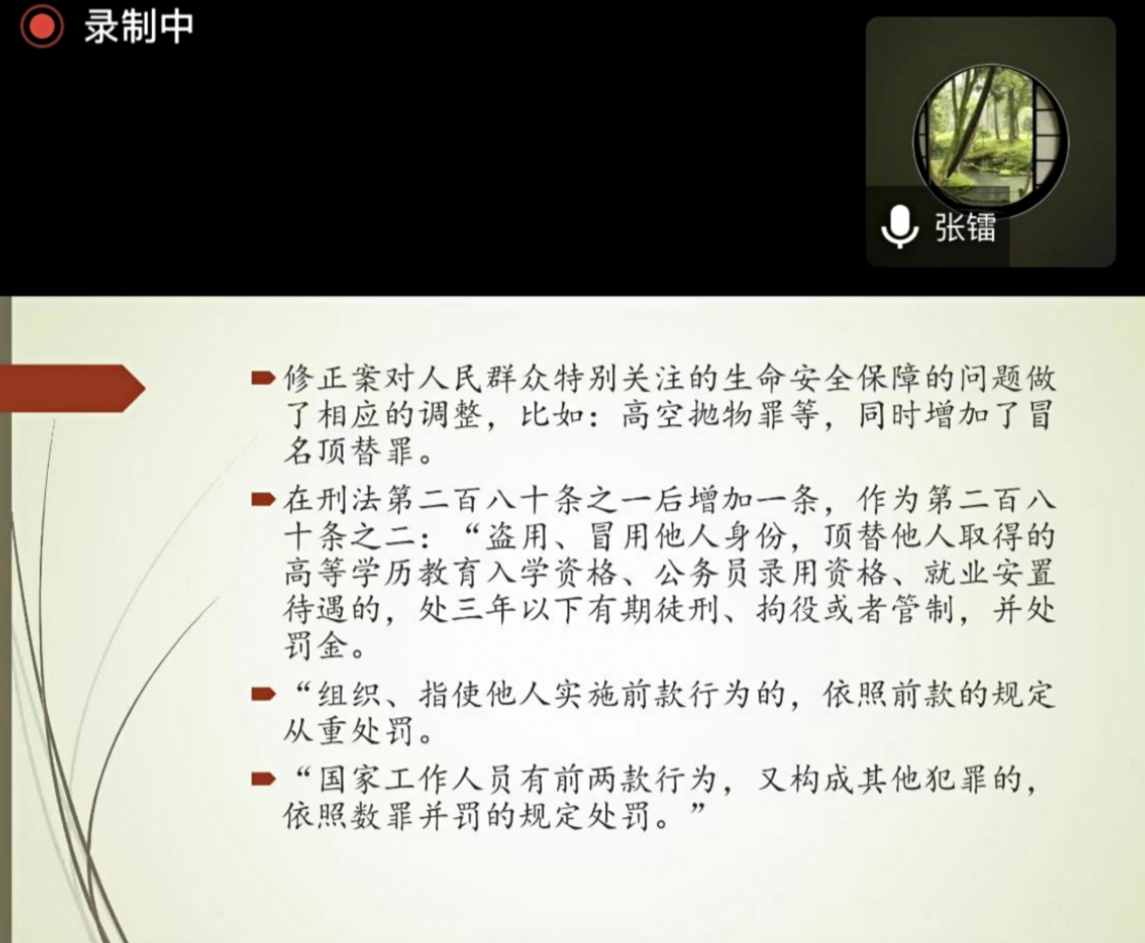 接着,张镭教授向各位同学解释了此次《教育法》修订的现实背景。首先是基于中国特色社会主义建设的需要,以及被社会广泛关注的陈春秀被冒名顶替上大学这一热点事件作为导火线,成为了本次《教育法》修订的诱因。同时,也是《教育法》与《刑法修正案(十一)》在相关规定上的有效衔接与协调,以人民群众最关心的问题为导向进行立法。