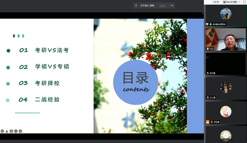 紧接着,朱星一同学又给同学们分享了自己的专硕备考经验。从备考专业课各科目所使用的教材资料到课程老师的选择,再到公共课的学习经验与方法,朱星一同学给同学们带来了实实在在的“干货”分享。同时,她还讲解了备考时期的注意事项以及备考方法,强调在备考期间选择阶段性的备考计划,更有益于保持学习的积极性。