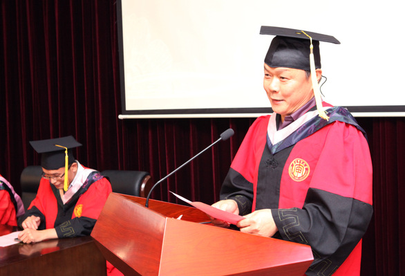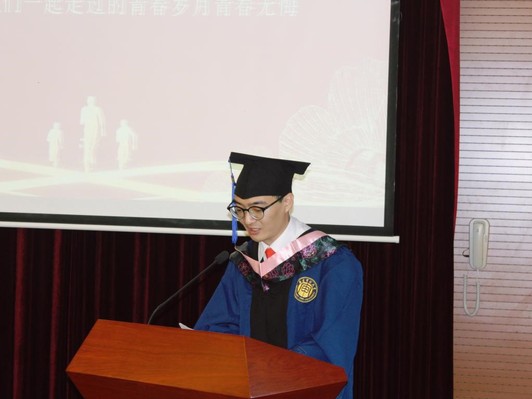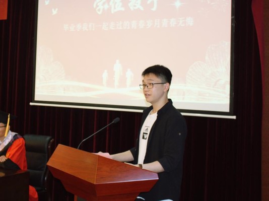 师恩厚重,母校情深。毕业生代表戴晓军同学发表了毕业感言。戴晓军同学回忆了在润泽湖畔、在文济楼前的学习和生活,对学院老师们的辛勤付出表示衷心感谢,同时也分享了自己的学习体会。希望学弟学妹们带赤子之心,怀感恩之心,携着宁静之心继续远航,希望必一运动越来越好。