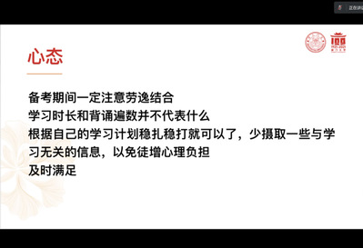 厦门大学研究生在读的陈凯薇同学着重向同学们分享了心态调整的经验。她提醒同学们,备考时要张弛有度,要多关注自身身体健康情况,不能因焦虑而拖垮身体。她建议同学们备考期间常去图书馆、自习室,以更好地进入状态,同时避免陷入情绪内耗。
